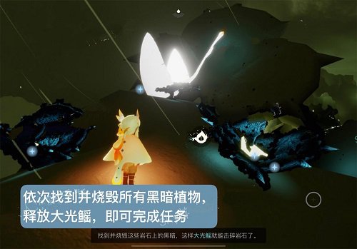 靠近黑暗植物,依次烧毁它们,释放出大光鳐,任务就完成了。